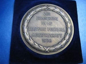 Original Spieler Medaille von Ernst Poertgen zur Erinnerung an die Fussball Meisterschaft 1936 | Rückseite der Medaille | |||